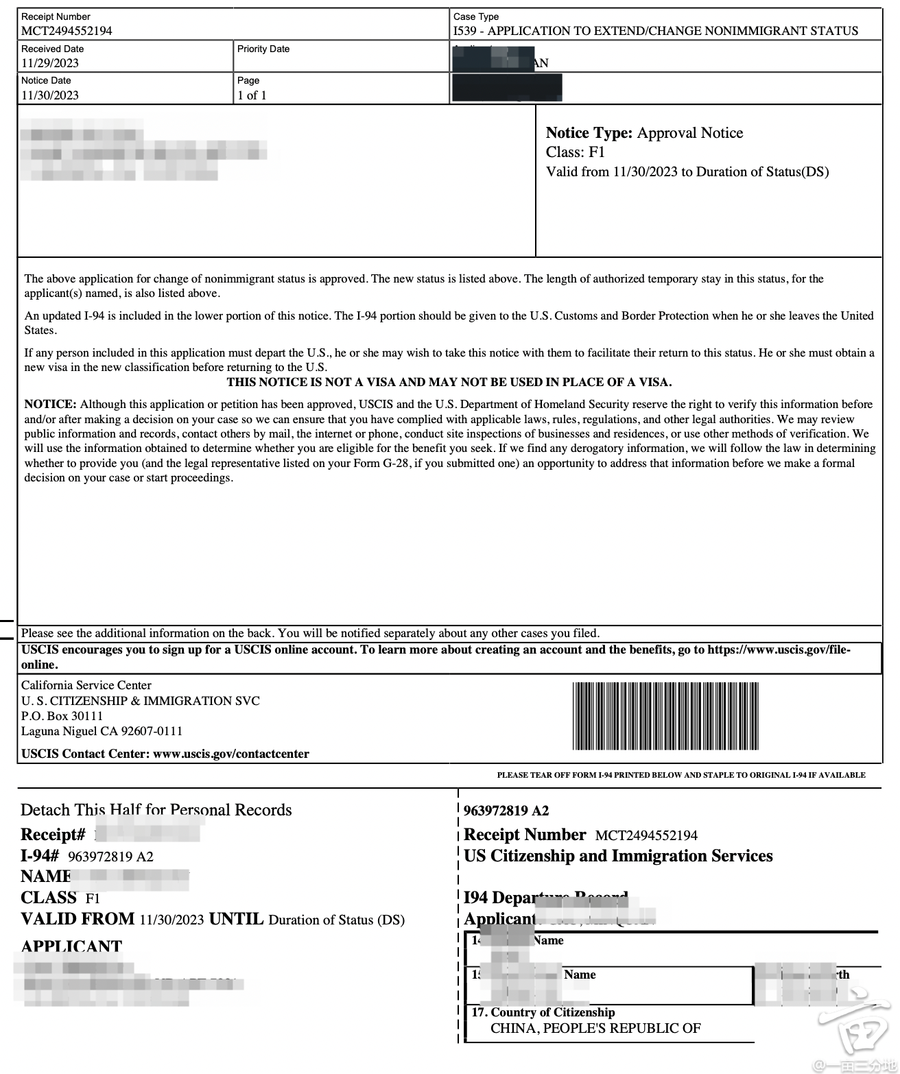 这个过程有点离奇,从递交完整材料到发放Approval Notice, 总共1一天获批(如果算上第一次补缴材料,那就是2天),因为网上之前看到的经历都是说在境内从F2转F1,如果不加急需要4- 10个月,加急的话,也得1 - 2 个月。