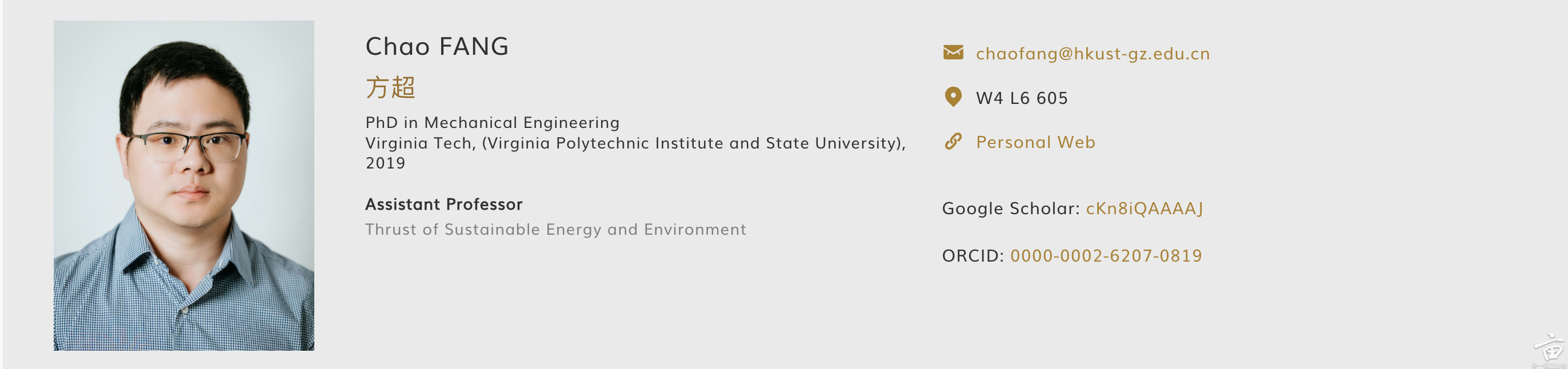 合作导师简介方超,本科毕业于中国科学技术大学,博士毕业于美国弗吉尼亚理工大学,美国加州大学伯克利分校与劳伦斯伯克利国家实验室的博士后。2024年1月加入香港科技大学(广州)功能枢纽可持续能源与环境学域,担任助理教授(博士生导师)。方博士主要从事新兴能源应用中跨尺度输运机理的理论计算研究,包括锂电池中浓溶液聚合物电解质的离子输运、页岩等非常规油气资源开发的多相纳米流动等研究。至今以第一作者(含与实验共一)在Nature Materials, Physical Review Letters, JACS Au, Chemical Science等期刊发表论文18篇, 总计在国际知名期刊上发表论文33篇。受邀任JCR二区期刊的客座编辑,并担任Capillarity期刊的青年编委。