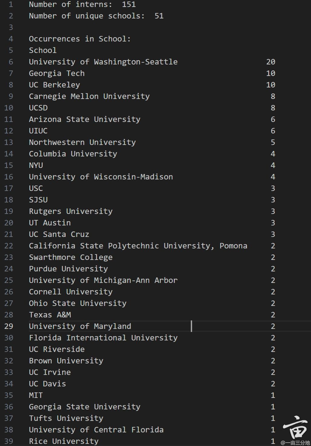 楼主拿到了亚麻西雅图25 summer sde实习的offer。非严谨向统计了一下同期实习生的出身院校,统计方法是爬取亚麻实习生forum上的打招呼信息,然后半手动汇总院校信息。截图是楼主的统计结果。