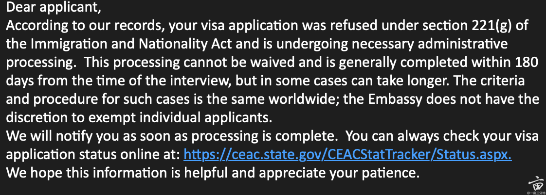 - 1point3acres.com (补发check材料的邮箱,收到材料后的自动回复明确说了不会回答任何签证进度问题)