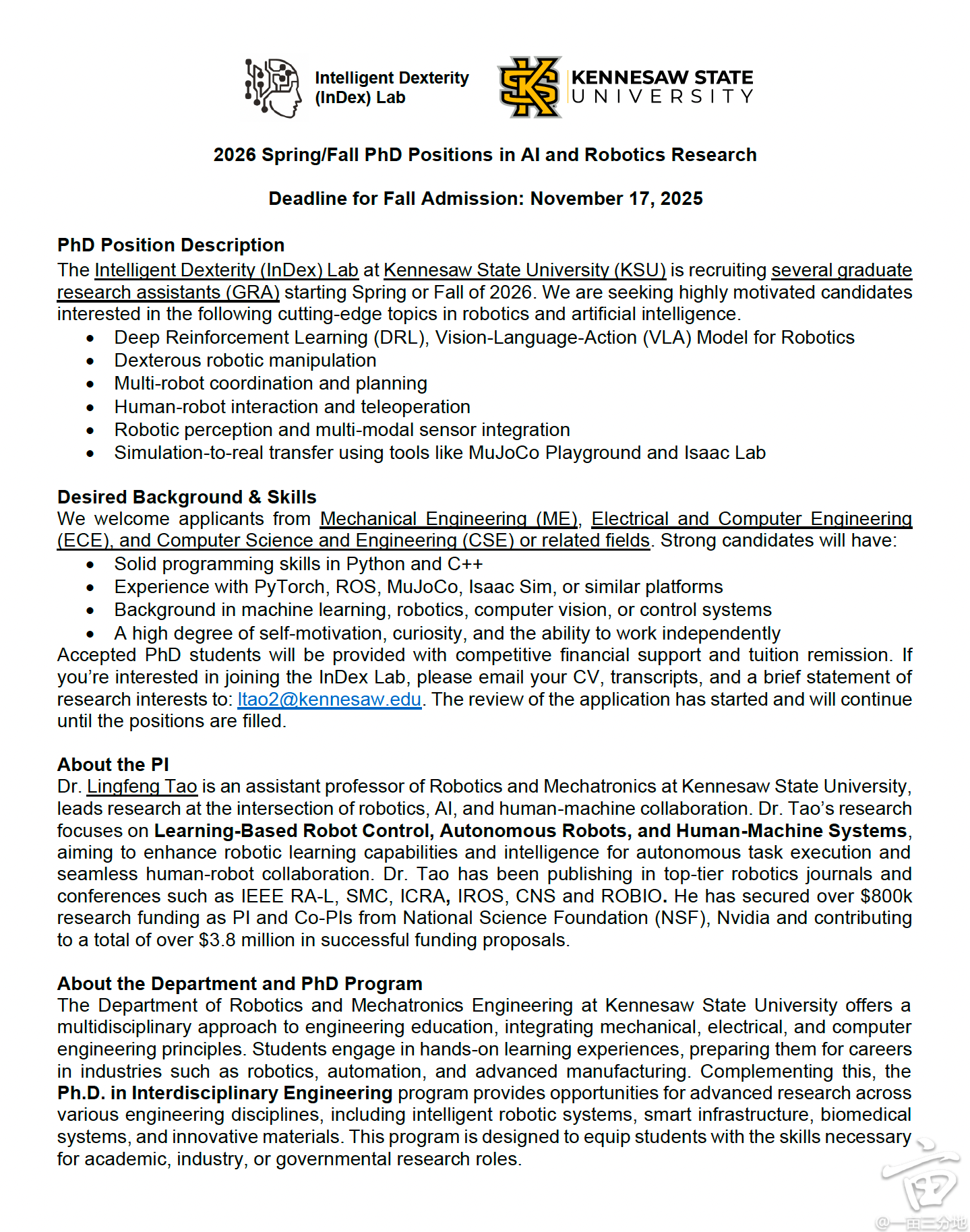 美国亚特兰大肯尼索州立大学 Intelligent Dexterity (InDex) Lab 2026春/秋 博士 招生