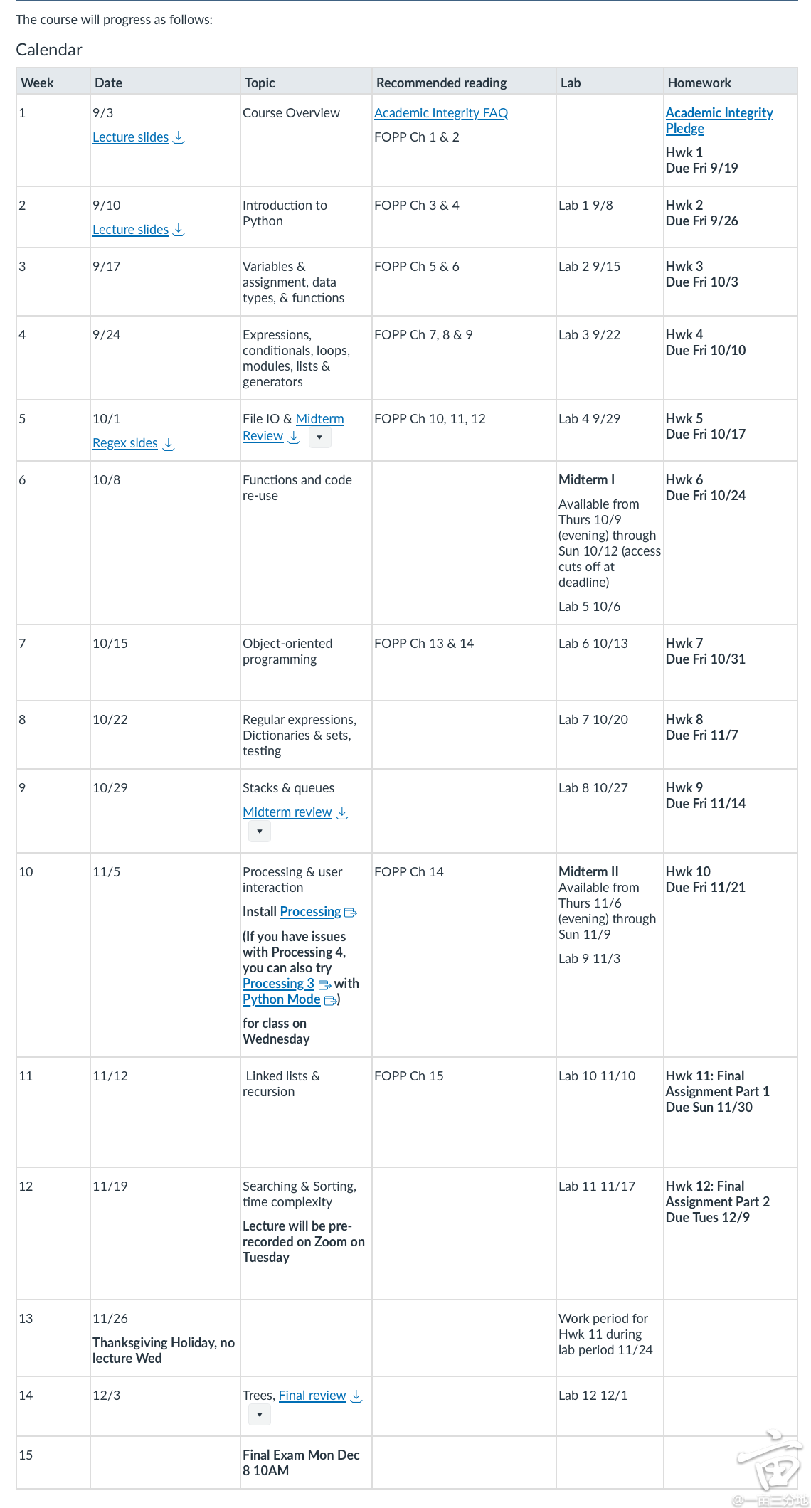 老师:Dr. Tony Mullen,他把Python讲的很细,属于是基础语法嚼烂了喂给你吃的那种,基本每次都要签到,有2次线上midterm测试和1次线下笔试的final,题目非常简单。(Recitation 不点名,可去可不去)
