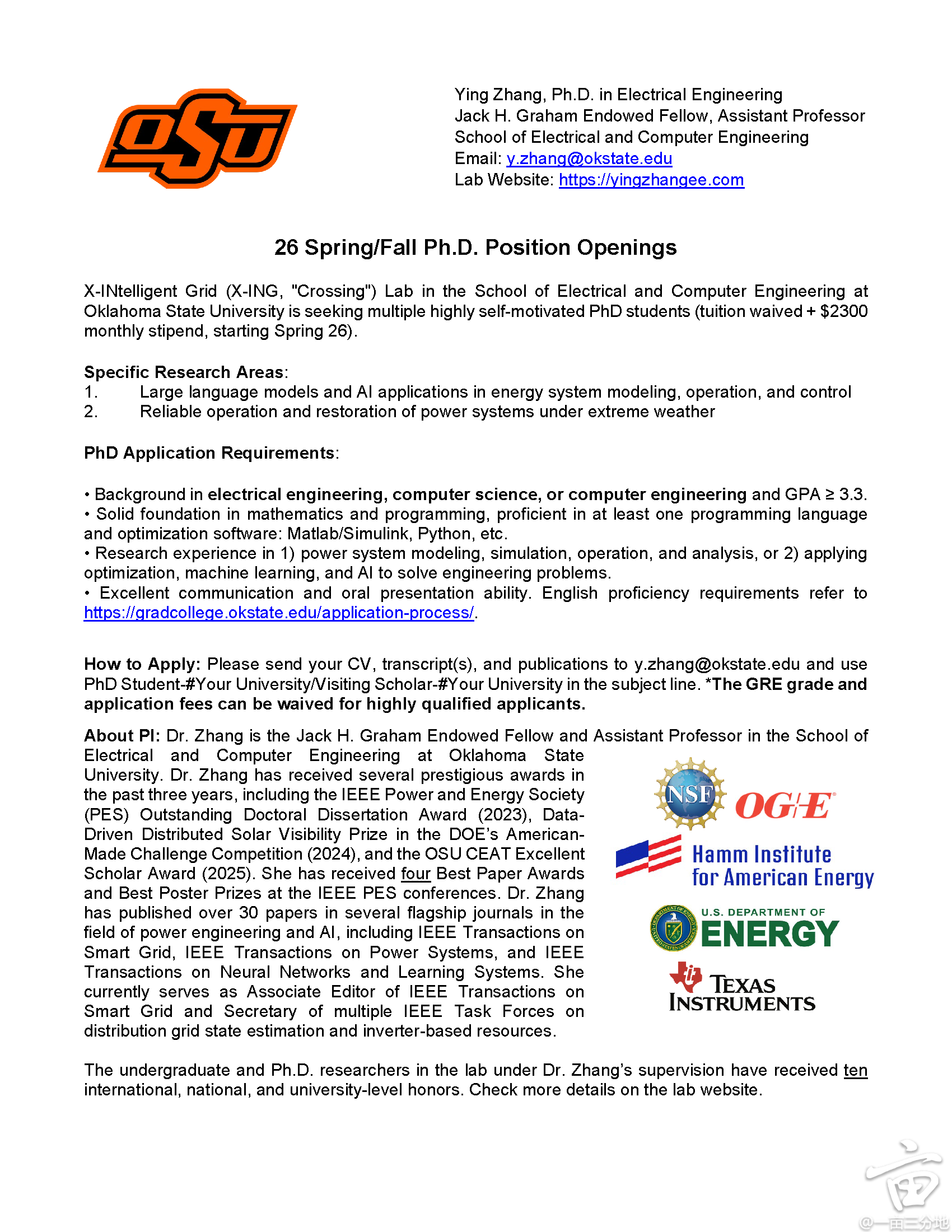 张莹博士招收2026入学全奖博士研究生(学费全免+$2300 monthly stipend)。课题组当前聚焦基于智能电网的交叉科学研究。具体研究方向包络但不限于为1) 极端天气下的电力系统可靠运行与恢复 2) 数字孪生,大语言模型,与人工智能在电力系统仿真运行的应用 3)高比例可再生资源渗透下的配电系统运行优化控制。
