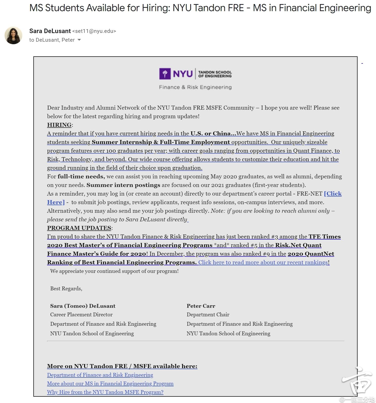 NYU Tandon MFE 经常给校友发email帮助学生找工作