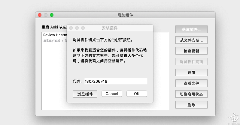 通过工具->附加组件,进入安装插件页面。直接输入插件code:1807206748,按提示点击安装。安装完毕后,重启anki。
