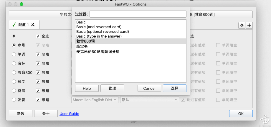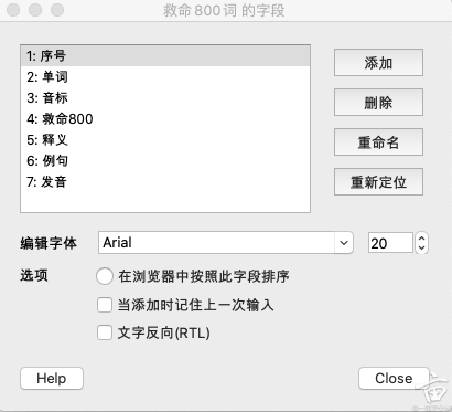 通过工具->管理笔记类型,进入笔记类型管理页面。添加一个“救命800词”的笔记类型。添加附加字段: