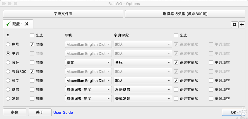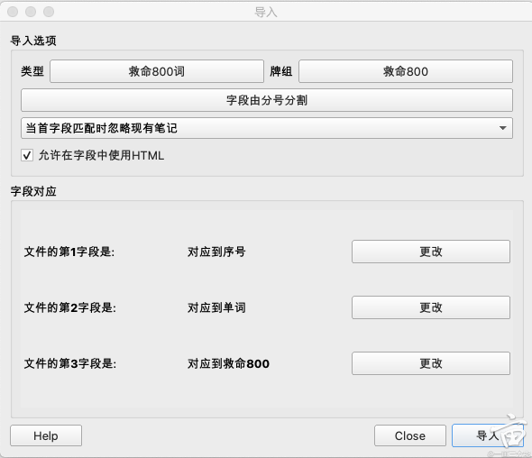 第二列可选字段是否忽略,即不需要插件帮忙自动填充。序号、单词和救命800词释义都为导入字段,故忽略。