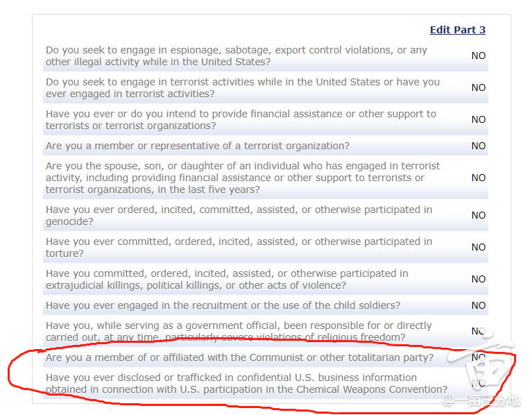 在review ds160的时候,security 部分part3 最后两道题变成了是不是属于党派之类的: Are you a member of or affiliated with the Communist or other totalitarian party?