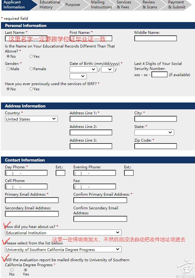 第一步,填个人信息,注意名字别填反了,how do you know us一定选南加大,不然后面没法进行。