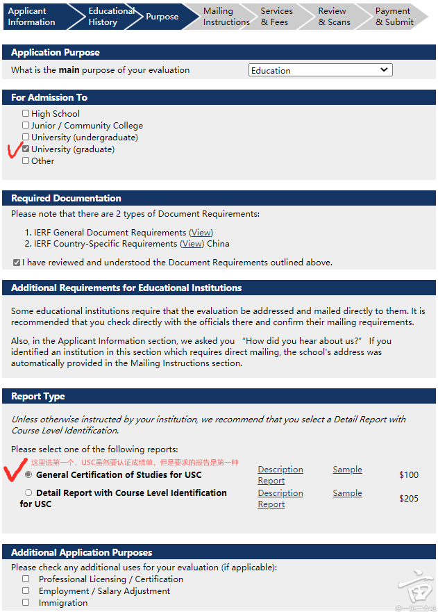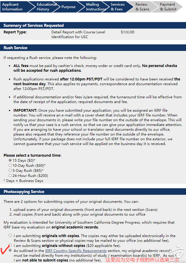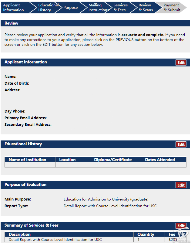 第六步,确认自己的信息。我那个钱数不对,因为第三步选错了,这里为了再次提醒,虽然要交成绩单,但是我们给USC的报告是General Certification of Studies for USC, 这里多交了钱也没事,最后IERF会退给你。