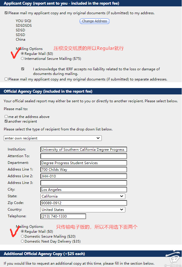 其实在2020年7月份的时候,学校还是要求必须寄送纸质版,所以你在网上能找到的所有攻略大多是跟寄送纸质材料的相关。但是就在8月份,IERF给USC单独开了一个专页(ierf.org),在USC IERF专页的View Country Specific Requirements里面明确说明可以寄送电子版,而且已经有很多小伙伴成功了。