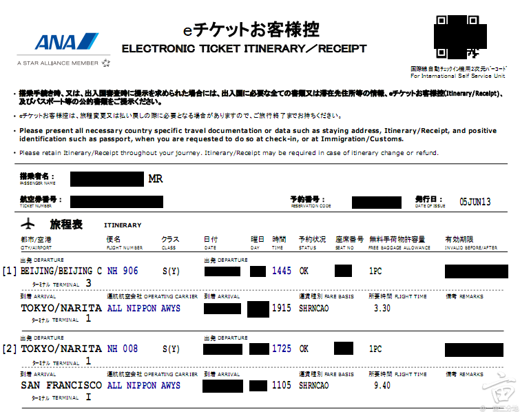 联程机票行程单:不用去机场或者全日空北京办事处去打机票(好像也打不了吧……),只要在网上下载了自己的机票行程单的PDF版,打出来即可。
