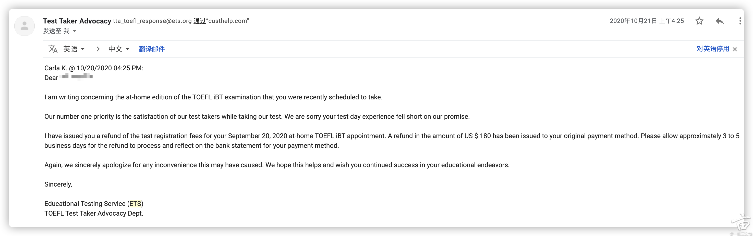 我最开始的诉求是给我一次重新预约的机会,不过最后ETS的解决方案是退款。由于本人没有VISA卡,当时是找淘宝代付的,于是退款到了别人的账号,店家说没有收到退款,我也无法求证,遂损失了一次考费。
