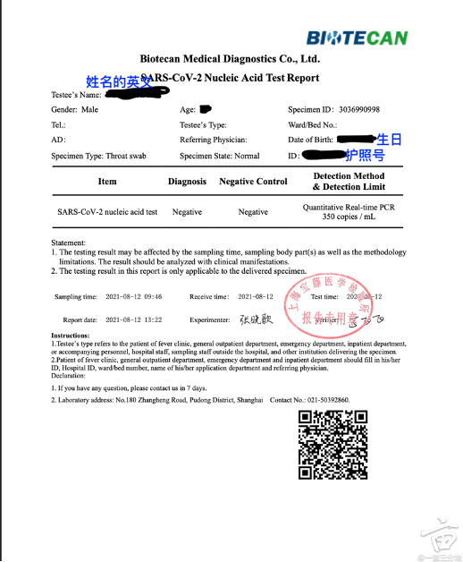 8月12日的早上9点半, 我在上海浦东新区的宝藤医学中心做了核酸检测, 捅的是喉咙, 英文版中文版都有, 有护照号、生日、时间日期、测量方法和责任人联系方式. 具体可以给大家提供一个我的截图(隐去了部分信息)