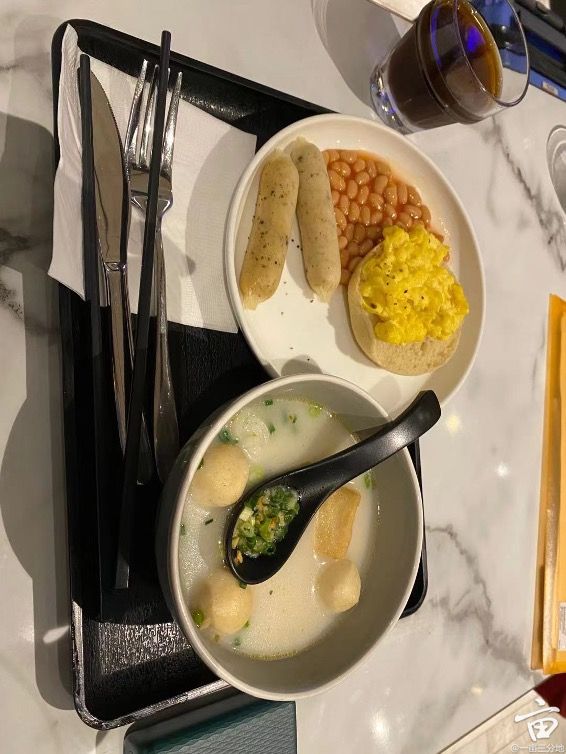 之后就去寻找那个在飞猪上买的券的贵宾室, 里面有好吃的一些餐饮, 但是人很多要排队入场, 在门口排了得有半小时左右, 于10:30pm才进入贵宾室. 点了一份全日早餐炒蛋香肠 + 鱼蛋粉, 很舒适的喝了一杯芬达回了点血. (PS: 见下图, 真的很好吃, 几口就全部吃完了, 可能也是因为饿了)