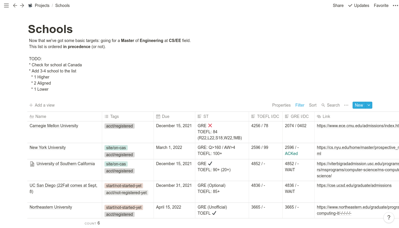 现在许多学校的申请似乎还没开始,所以先简单地讲一讲我自己在 Notion 上的安排。