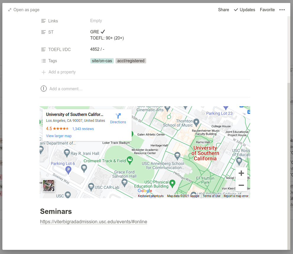 这是其中一所学校的子页面。开头会显示表格各个 column 的内容,下面可以像一般的 Notion 页面一样放置各种内容(包括子页面),像是地图、文件、有用的链接之类。