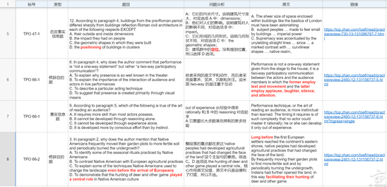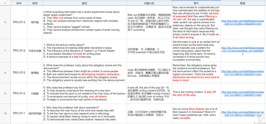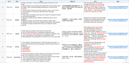 如果听力水平比较一般的话,没有足够的练习还是不够的,我每天都会花最多的时间给听力,一天一套TPO加精听。但是在认真做了这以上之后,我还是发现我的听力分数总是困在23分左右,很难提升,常常emo自己为什么付出了这么多但是没有看到效果,于是最后一次考试前我更加注重于总结。我设计了一个错题表格如下,对每一个错题认真分析,回归原文,多听。