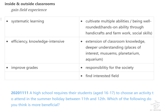 所以如果像我一样很难在拿到题目后快速想好分论点的话,可以做一些论点的积累。例如最常考的教育类话题,如果题目是讨论室内还是户外学习的话,可以列出: