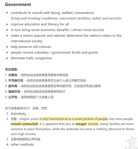 顺便贴上真题和范文的索引。如果遇到政府、政策类的话题时,也很容易从几个方面来想到论点,例如: