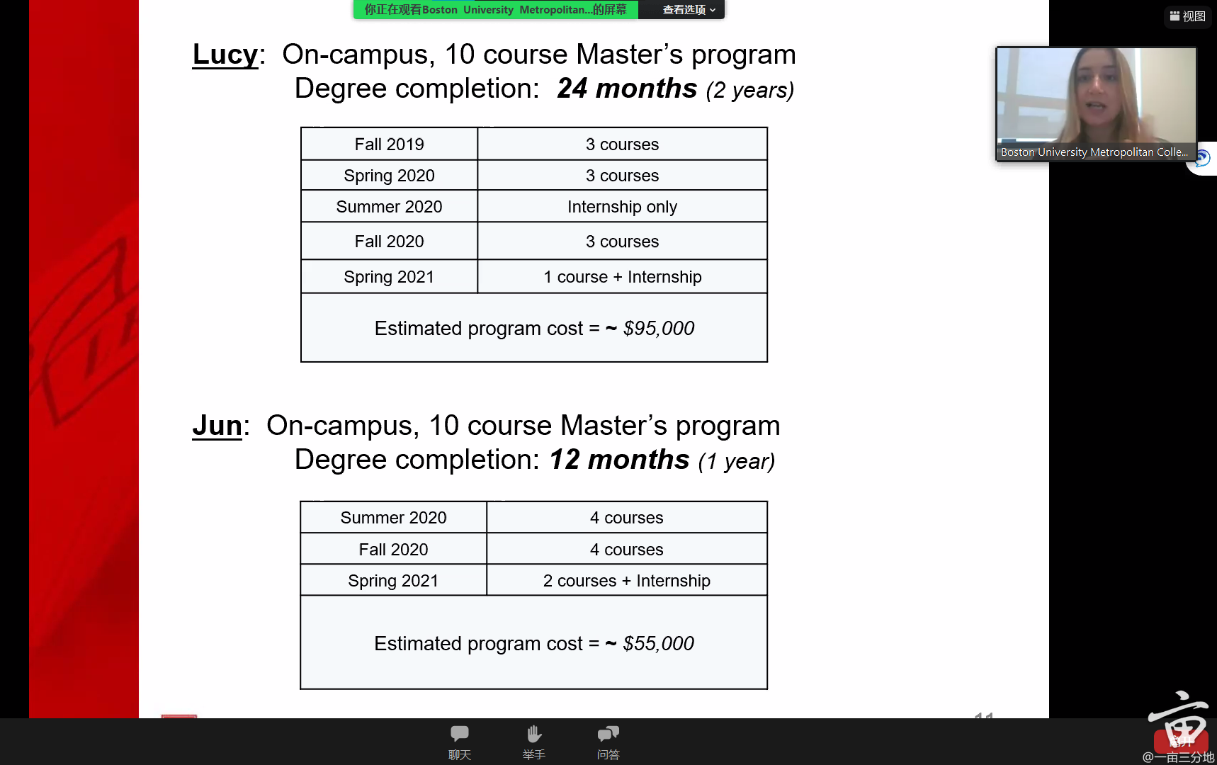 - 第一种是上满两年,fall 入学后上两个 full-time semester,然后做一段 summer intern,再上一个 full-time semester,最后一个学期选为 part-time 去做第二段实习。图上给最后一学期排了门课,但其实完全可以在之前的学期把所有课修掉,最后一学期不上课。这样下来整个项目的学费是九万刀。